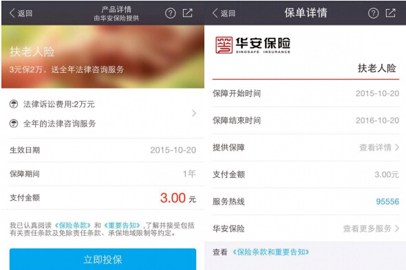 据内地传媒报道,保费为三元人民币,保期一年,由华安财产保险股份有限公司承保,提供12个省市用户购买,保险还配有投保人全年法律谘询服务。