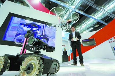 10月19日,在中關村展示中心,一位創業企業代表現場展示自主研發的無人機和智能機器人平臺。