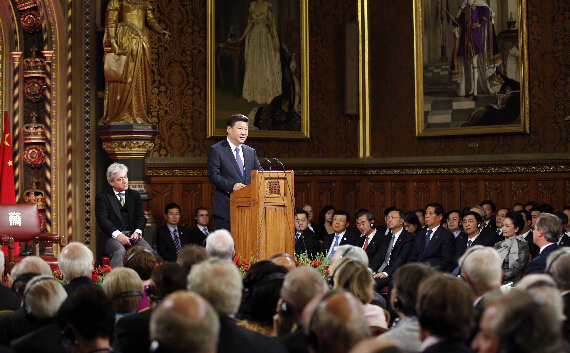 在西敏寺英国国会大楼的皇家画廊,习近平向英国国会议员及其他宾客发表演讲。习近平指,首日访英行程深切体会两国关系的蓬勃朝气及两国人民深情厚意,他对推动中英关系迈向新台阶充满期待。他说,英国是最先探索代议制的国家,而中国的民本法治自古有之,中国当前正全面推动依法治国,坚持法律面前人人平等,两国立法机构可增加交流互相借监。习近平是首位在英国国会发表演说的中国国家元首。