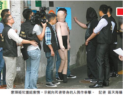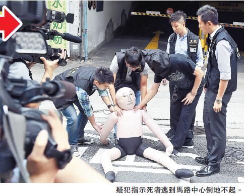 大約10分鐘后,探員帶同一個人偶到店外鄰近的停車場出入口,讓疑犯模擬當日案發整個過程。疑犯先將人偶推向牆邊拳毆,繼而以右腳進行數次膝撞腹部及下體,未幾人偶跌坐地上,疑犯向探員說了幾句話后,探員再將人偶搬到馬路中心放下,估計是死者一度起身走到馬路中心,最后不支倒地,疑犯則上前察看人偶傷勢,再向行車天橋底方向逃去,整個重組過程約1小時,完成錄影后,疑犯被押上警車帶署。