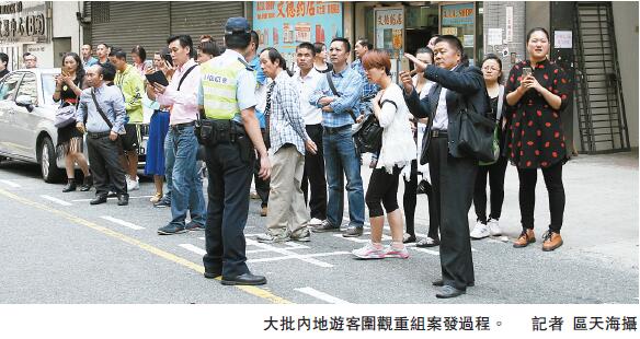 【香港商報網訊】記者區天海報道:警方閃電偵破紅磡民樂街內地男游客遇襲身亡案件,昨日將疑犯押返現場進行案件重組及錄影,疑犯示範整個襲擊過程,其中包括拳毆、膝撞下體,直至事主倒地,探員將過程攝錄,兩名涉案被捕男子今日提堂控以誤殺罪。現場附近大批游客駐足圍觀,看到施襲經過感到嘩然,并表示不知有游客被毆死亡,但普遍認為只是個別事件,亦對香港法治有信心,不會因此害怕來港旅游。