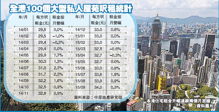 根據中原地產新簽租約統計,今年9月份全港100個大型私人屋苑的平均尺租錄得34元,租金的按月升幅由7月升1.8%,8月升0.9%,進一步降至9月升0.3%,增幅明顯收窄。按季方面,第三季私人住宅實用面積平均租金錄得34元,與第二季的33元相比,按季上升3%。
