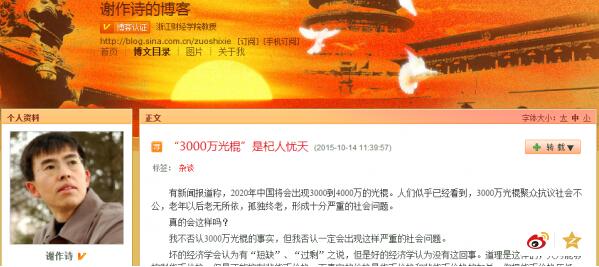 經濟學者又來談社會問題了。浙江財經學院教授謝作詩10月14日在博客中撰文《“3000萬光棍”是杞人憂天》,用經濟學原理來解釋這個社會問題,稱收入低的男人可以幾個人合起來找一個老婆。他還表示,允許同志合法結婚,可能也能緩解3000萬光棍問題。
