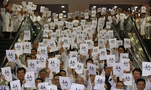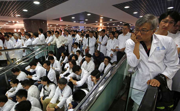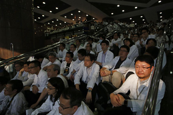 2015年10月20日,中國香港,香港伊利沙伯醫院大堂,數百名醫生靜坐,請求抗議,要求薪酬機制與公務員看齊。高級公務員獲額外加薪3%引發風波。