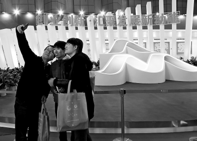 昨天,參觀者用手機自拍功能跟雙創標識合影。本報記者 吳鏑攝