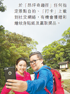 在上述期間,賓客可乘纜車到昂坪,再暢遊「昂坪奇趣徑」,於奇趣徑內任何指定景點自拍、「打卡」上載到社交網絡,並在360旅遊資訊中心向職員出示已上載的照片,即可獲贈精美彩繪紋身貼紙一張(先到先得,送完即止)。參與的賓客更有機會角逐其後選出的「獎上獎」及「終極大獎」,贏取豐富獎品。此外,亦特別製作了三條較高難度的郊遊徑的資訊(彌勒山郊遊徑、石壁郊遊徑及鳳凰徑),讓喜愛挑戰自己的朋友可透過QR碼下載並閱覽有關資訊。