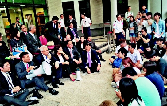 面對學生的步步進迫,校董一退再退,最後「乖乖」走出會議室,與學生席地對話。不過,這只是一場傳媒鏡頭前的政治騷,彼此既無準備,又無共同議題,全無交集,怎有成果?有校董直批,對話猶如「公審」。的確,從現場新聞片段傳來的影像,令人即時聯想到當年的紅衛兵!