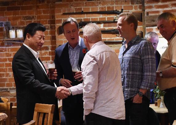 会晤结束後,习近平在卡梅伦陪同下乘车前往当地小镇体验酒吧文化。两国领导人边饮啤酒,边品尝英国特色小吃“炸鱼和薯条”,并同当地民众交谈。