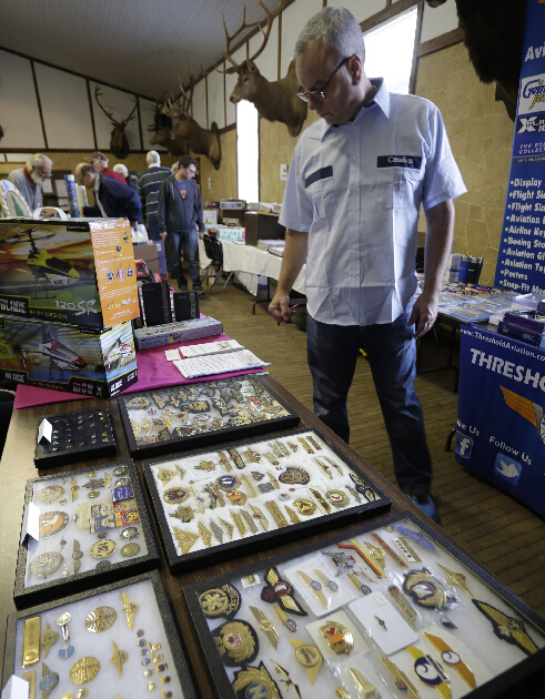 一名航空愛好者在航空收藏品展上觀看飛行員徽章。