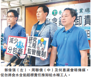 【香港商报网讯】记者李淇报道:屋恏食水含铅量超标事件被揭发后,房屋署、水务署以及由法官率领的3个调查委员会都陆续展开了调查工作。当中水务署的专责小组初步报告就将矛头指向水喉工人,指因工人技术欠佳,致铅进入水管。香港建造业总工会就批评类此说法不负责任,对水喉工人并不公道,因为大型工程中,收取日薪的工人不会购买大量焊料,亦只负责确保水喉不会漏水,强调工人「一点责任都没有」,认为政府应彻查哪方在采购材料时出错,而不是意图将食水含铅超标责任推卸予工人。