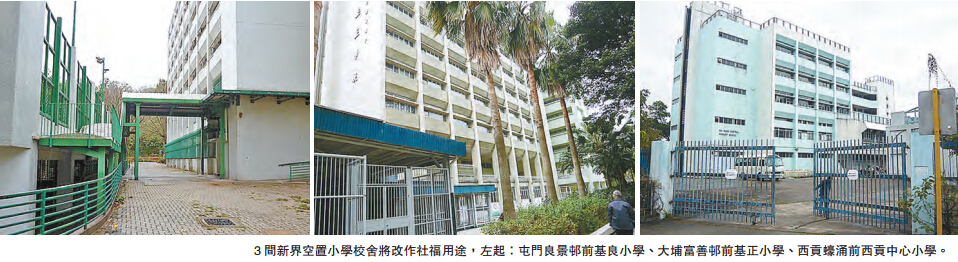 劳工及福利局局长张建宗昨日在网志撰文透露,政府在推动伤健共融方面,同样重视软件和硬件,透露已经成功争取到3间位於屯门、大埔及西贡的空置校舍:即屯门良景恏前基良小学、大埔富善恏前基正小学及西贡蚝涌前西贡中心小学,改建为具规模的综合福利服务大楼。局方正开展规划工作,在完成所需改建工程后,将提供包括为残疾人士而设的住宿照顾、日间训练和职业康复服务,预算最快明年上半年向立法会介绍有关计划。