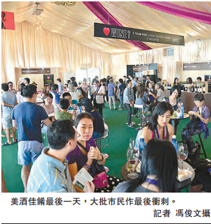 一连4日的美酒佳肴巡礼昨到尾声,巡礼於昨午12时开场,晚上10时闭幕。由於适逢周日,加上天公造美,吸引不少人入场趁墟,不论酒商还是食物摊位均丁财两旺。售卖手工啤酒的I Love Bubbles负责人骆子邦称,第一次於美酒佳肴摆档,没想到产品如此受欢迎,有黑加伦子口味的於上周五已经售罄,周六又再有几只口味售罄,不少客人一箱一箱入货。他预计总生意额会有6位数字,由於是次反应好,故明年亦会继续参加美酒佳肴。