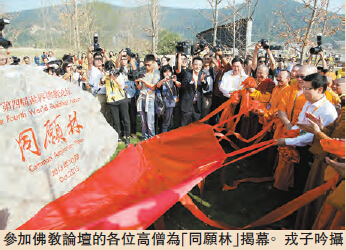 10月23日下午,第四屆世界佛教論壇「同願林」種植暨紀念碑揭幕活動在無錫市靈山小鎮狺拈花灣舉行。