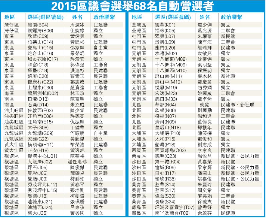 今屆區議會選舉有68位候選人自動當選,數字比2011年上屆區議會選舉的76人少8人;今次區選自動當選的議席中,民建聯占21席,所占數目最多,當中包括於東區錦屏當選的港區人大代表蔡素玉、在北區服務多時的劉國勋;工聯會自動當選的議席有7席,當中包括立法會議員郭偉強及麥美娟;而郭、麥2人也是19位有參與區選的立法會議員中,得以自動當選的2位。