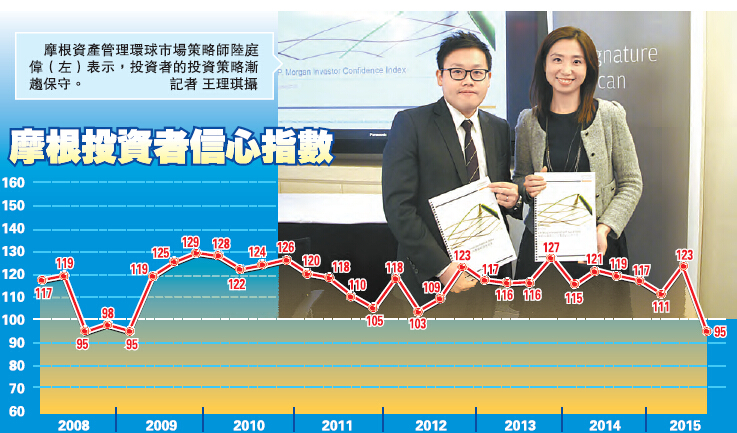 【香港商報網訊】摩根資產管理最新調查報告顯示,本地投資者對香港未來6個月投資市場信心顯著下跌,以滿分200點計,整體信心指數跌28點至95點,這是自2009年第一季度以來,首次跌破100點中間水平(大於100代表樂觀)。調查并發現,全球股市持續波動成為投資者信心受重創的「罪魁禍首」。香港商報記者王理琪