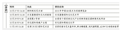 文化創意主題活動將通過展覽、新品發布、沙龍論壇、品鑒拍賣等多種形式展示。例如2015中國3D技術與創意博覽會、中國國際時裝周2016春夏新品發布會、北京歡樂谷第九屆萬圣歡樂節等。