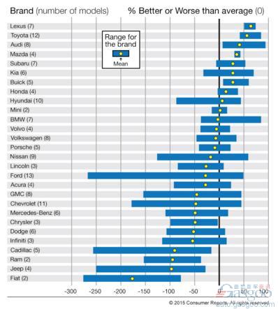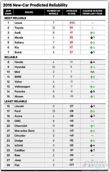 蓋世汽車訊 美國《消費者報告》雜志近日公布了最新的2015年汽車品牌穩定性排名,除雷克薩斯、豐田、沃爾沃等品牌排名未變,大部分主流品牌座次有所變動。