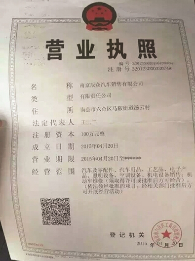 記者從一位受害人處看到了南京辰眾汽車銷售有限公司的工商營業執照,經營范圍確實為汽車及相關用品的銷售,但法定代表人竟然姓王。據受害人介紹,該公司實際控制人應該是潘某。至于兩人之間是何關系,則不得而知。據其介紹,辰眾汽車其實更多的是在網上接受訂單,從別的經銷商處拿車銷售,賺取差價,自己并沒有代理什么品牌的汽車,實則相當于一個汽車中介機構。