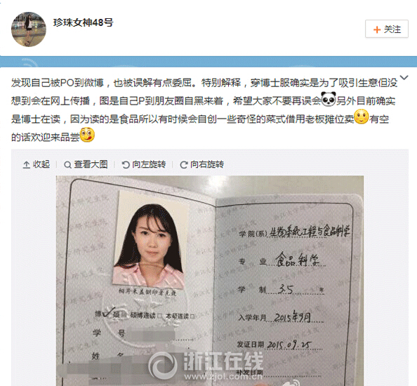 今天中午11点多,“@珍珠女神48号”发微博澄清“博士服照片”,称图片是自己发在微信朋友圈“自黑”的,朋友把图片发到微博让她“被误解有点委屈”。姑娘还在微博中澄清自己“目前确实是博士在读,因为读的是食品所以有时候会自创一些奇怪的菜式借用老板摊位卖”。
