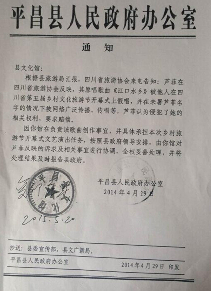 平昌县政府办公室向该县文化馆发通知,要求协调处理女歌手芦菲所反映的其原唱歌曲被假唱一事。