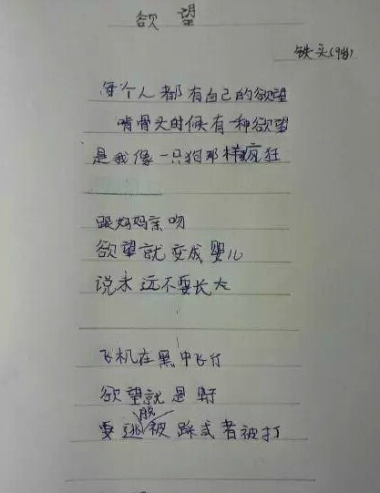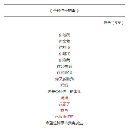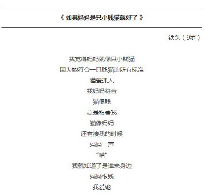 【9岁男孩写诗:妈妈很贱我爱她】近日,中国最小的诗人,9岁的梁胜杰在清华大学出版社出版了系列萌诗,他6岁起写诗,已写了200多首诗,“开始是妈妈逼得,被逼到了9岁...”他的诗,满是萌萌哒:“妈妈很贱,我爱她””“你推我你又亲我..妈妈我服了..