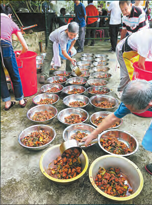 村民在樹林草地席地而坐,吃得津津有味。