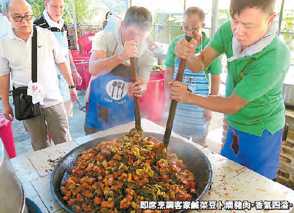 今年祭祖所用豬上肉及腩肉為900至1000斤,供約100圍享用,分午吃30多圍,晚吃60多圍。傅振光說,圍數近年不變,但人卻少了些,主要是參與拜祭的十多廿來歲村民減少。不過,美味的客家菜吸引到一些外來人如行山客,傅氏族人也好客,歡迎他們品嘗,午餐更為豐富,多了一味粉絲紹菜豬雜湯。而廚房的工作人員大多是村民,其中李氏兄妹自小與傅氏村民為鄰里,大家由細玩到大,感情要好,所以一呼百應前來幫忙,他們的兄長更是豬肉供應者。