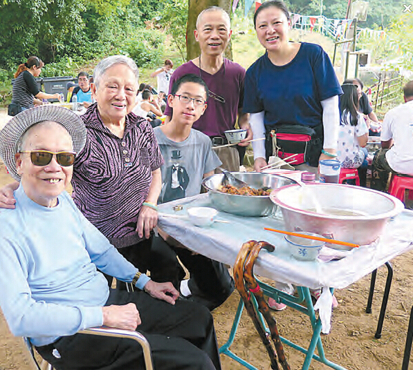 村民在祖居地附近的樹林草地席地而坐,分享盤中色香味俱全的美食。88歲的傅子琴與同歲的太太劉蘇,偕同兒子、媳婦及孫兒,三代來向祖宗致祭。傅子琴說,父親8歲就離開清快塘往荃灣打工,他也在那裏出世,及長至6、7歲就隨父祭祖。想起80年前的清快塘,他仍記憶猶新,說有好多樹,好多農田,有一排屋仔,但交通就相當不便,只有由界限街至元朗的巴士會經深井,一天兩班,但他說家裏窮,拜山要行路,由荃灣到深井一個半小時,深井到清快塘一個小時,但他不覺辛苦。小學畢業後,日本侵佔香港,只有十三四歲的他,成為抗日宣傳員,在街頭表演,後來結縭的太太劉蘇亦在抗日時期做過通訊員。