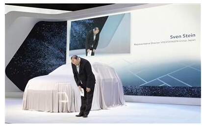 在剛剛開幕的東京車展上,大眾日本公司負責人斯文·斯坦遵照日式禮節鞠躬致歉。