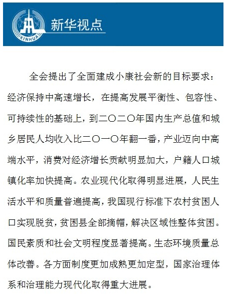 @新華國際:#五中全會#全會認為,到二〇二〇年全面建成小康社會,是我們黨確定的“兩個一百年”奮鬥目標的第一個百年奮鬥目標。“十三五”時期是全面建成小康社會決勝階段,“十三五”規劃必須緊緊圍繞實現這個奮鬥目標來制定。