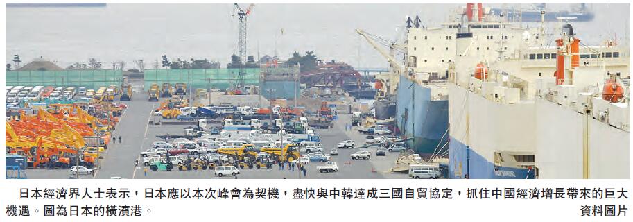 而日本經濟界人士表示,日本應以此為契機,盡快與中韓達成三國自貿協定,抓住中國經濟增長帶來的巨大機遇。分析人士指,目前中韓已正式簽署自由貿易協定,如果日本不能盡快與中韓簽署自貿協定,將直接影響到日本對華出口和經濟合作,甚至可能影響日本經濟復蘇。