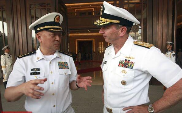 資料圖:2014年7月15日,海軍司令員吳勝利(左)與美國海軍作戰部長喬納森·格林納特交談。