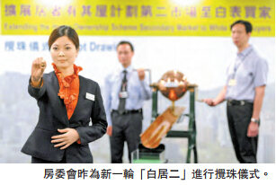 【香港商报网讯】记者冯仁乐报道:第二轮俗称「白居二」的白表二手居屋计划昨日搅珠,10组首先拣楼的将是申请编号最后两个数字为54、19、41、15、85、51、14、70、74、91的申请者。房委会资助房屋小组主席黄远辉表示,明年2月底会发出购买资格证明书,申请人最迟2017年2月购买单位。