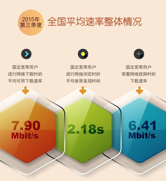 網易科技訊 10月30日消息,寬帶發展聯盟發布了第9期《中國寬帶速率狀況報告》,對2015年第3季度國內固定寬帶用戶訪問互聯網時的用戶上網體驗情況進行了報告。數據顯示:2015年第3季度,中國固定寬帶互聯網網絡平均網絡下載速率達到7.90 Mbit/s,用戶進行網頁瀏覽的平均首屏呈現時間為2.18s,平均視頻下載速率為6.41Mbit/s,全國基礎電信企業簽約用戶的平均固定寬帶接入速率符合度為113.09%。
