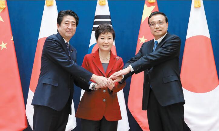 【香港商報網訊】正在韓國訪問的中國國務院總理李克強昨日下午與日本首相安倍晉三、韓國總統樸槿惠在首爾的青瓦臺舉行會談。在時隔約三年半舉行的中日韓首腦會談上,三方就以「正視歷史、面向未來前進的精神」合作促進地區安全與和平達成了共識,還一致同意努力促使中日韓自由貿易協定(FTA)談判有所進展、定期召開三國首腦會談以及明年在日本開會。三國首腦通過了寫入會談成果的聯合宣言。