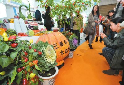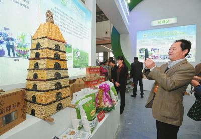 上圖:西安展區的“玉米大雁塔”獨具特色 左圖:約100公斤重的南瓜成為展會上一大亮點