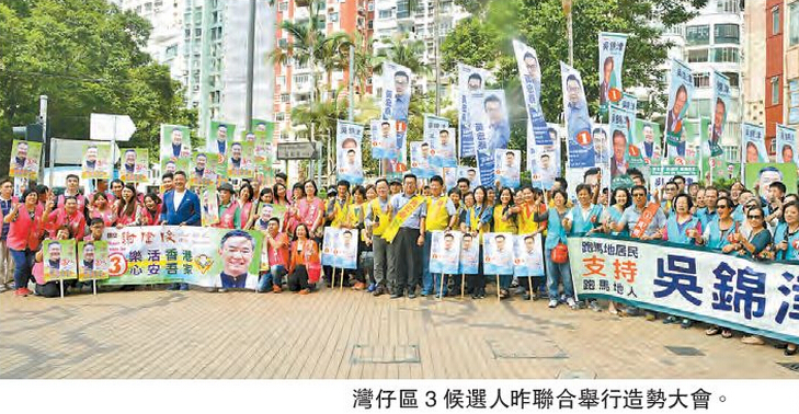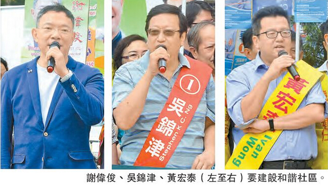 【香港商网报讯】记者王珈莉报道:距离区议会选举尚余半个多月,各区候选人近日积极进行宣传,向市民讲述政纲。湾仔乐活选区候选人谢伟俊、跑马地选区候选人吴锦津及司徒拔道选区候选人黄宏泰,有监於3区均属高中产选区,居民为中产专业人士,昨午举行联合誓师大会,3名候选人均强调,有信心为中产区居民创建心安质优的社区,将理性、和平的声音带入区议会及社区。