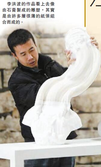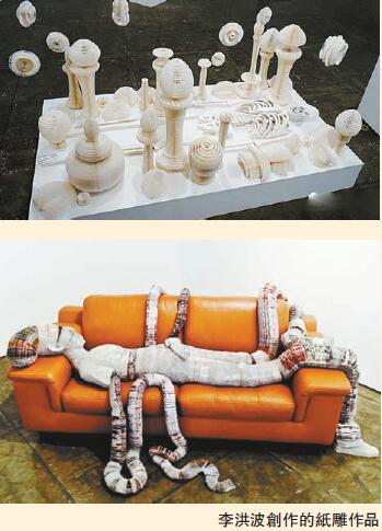 「紙張是中國的四大發明之一,我從小就對紙張有著特殊的喜好。中國傳統的紙葫蘆和紙燈籠等工藝給予我最初的創作啟發,因為紙張本身是柔韌而極具可塑性的。」李洪波介紹,紙品和造紙術在中國文化一直占有重要地位,已知最古老的紙張遺蹟可以追溯到漢代(公元前206至公元220年),他的紙雕創作繼承了這一源遠流長的歷史傳統。李洪波利用千萬層手制紙張連結創作紙雕,作品可用手任意拉長伸展,瞬間幻化成各種流動柔軟的形態,他的動態雕塑不僅為觀眾帶來令人嘆服的視覺效果,更挑戰大眾對雕塑的固定思維。李洪波在北京中央美術學院修讀期間,已對紙張和制紙歷史產生濃厚興趣,加上紙張價格便宜兼且隨處可得,對當時仍是學生的李洪波是非常吸引的素材。