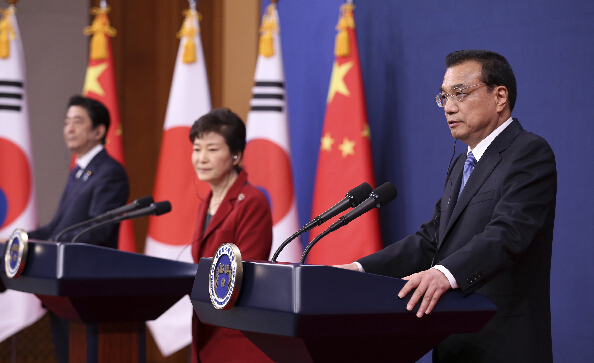当地时间11月1日下午,国务院总理李克强在第六次中日韩领导人会议後,与韩国总统朴槿惠、日本首相安倍晋三共同会见记者。