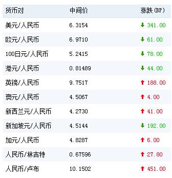 鳳凰iMarkets訊 中國人民銀行授權中國外匯交易中心公布,2015年11月3日銀行間外匯市場人民幣匯率中間價為:1美元對人民幣6.3310元,1歐元對人民幣6.9744元,100日元對人民幣5.2473元,1港元對人民幣0.81689元,1英鎊對人民幣9.7729元,1澳大利亞元對人民幣4.5367元,1新西蘭元對人民幣4.2828元,1新加坡元對人民幣4.5334元,1加拿大元對人民幣4.8354元,人民幣1元對0.67296林吉特,人民幣1元對10.0409俄羅斯盧布。