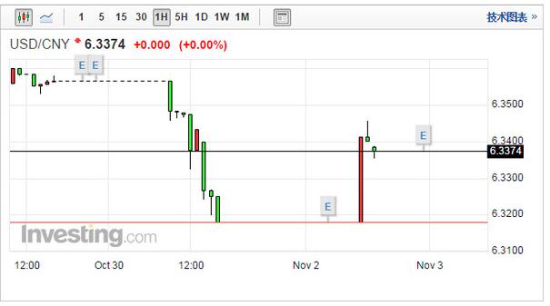 央行的缺席與10月底交易員觀察到的情況大相徑庭。10月28日美元/離岸人民幣觸及近一個月來高點6.4013,與在岸人民幣匯差擴大至400基點以上。中國央行旋即疑出手進行干預,即使在美聯儲加息概率大大升高的情況下,10月29日和30日兩天離岸人民幣兌美元大漲近800基點,在岸人民幣兌美元也上漲近400基點收于6.3175。