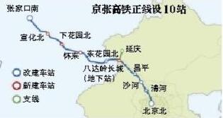 正線全長174公里,全線共設10個車站,北京和張家口各設5站。其中,北京市境內設北京北、清河、沙河、昌平、八達嶺長城(地下站)5座車站,張家口境內設東花園北(預留)、懷來、下花園北、宣化北、張家口南5座車站。其中,八達嶺長城站、懷來、下花園北、宣化北4個為新建車站,其余均為改建車站。而北京北、清河和張家口南為始發站。
