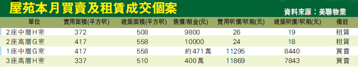 據美聯物業資料顯示,近月屋苑錄多宗買賣及租盤成交個案。買賣方面,一伙為3座高層H室,實用面積337平方呎,建築面積510平方呎,以400萬元成交,實用呎價約11869萬元。另一伙為1座中層G室,實用面積417平方呎,建築面積558平方呎,售價約471萬元。