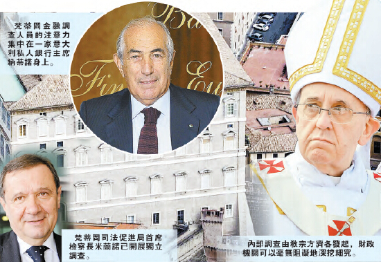 關注這個世界最小國家爆出的金融黑幕的媒體,大多數都把目光集中在其官方銀行,也就是俗稱「梵蒂岡銀行」的教廷遺產局身上。羅馬教廷遺產局掌管梵蒂岡在羅馬和意大利其他地方的房地產投資,支付梵蒂岡戶員工資,負責采購和人事任免事務。其下轄兩個司,其中一個也管理著梵蒂岡金融和股票投資組合。33頁的調查報告懷疑該司被外人用來參與和梵蒂岡無關的業務,遺產局職員可能共謀參與違法犯罪活動。