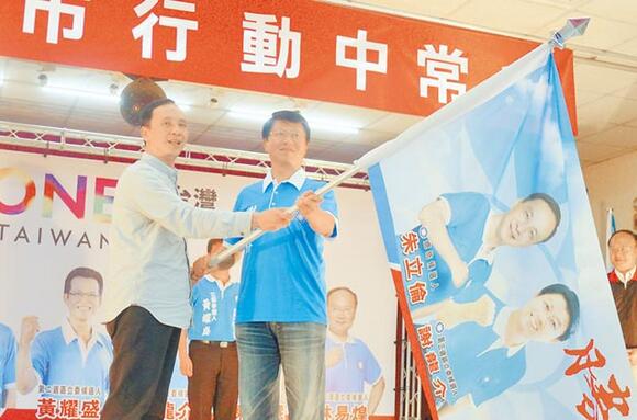 國民黨2016參選人朱立倫(左)授旗給第三選區“立委”參選人謝龍介。(圖片取自臺媒)