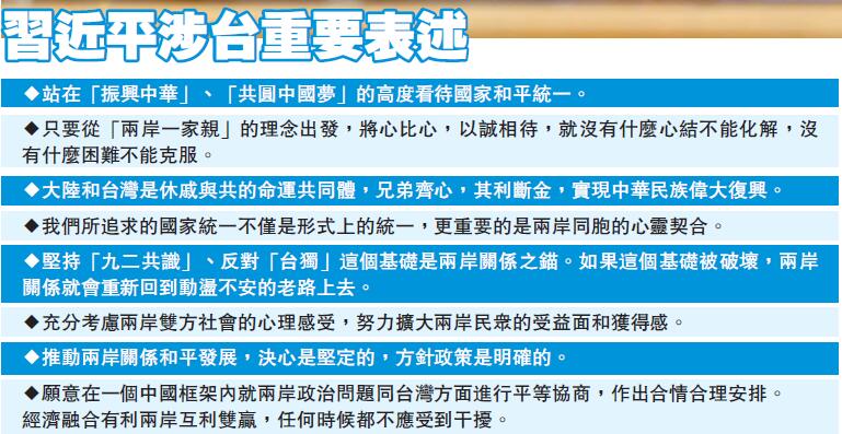 自2008年以來,兩岸關系在「九二共識」基礎下由緊張對抗走向交流合作、由戰爭邊緣邁入和平發展,7年來在各領域取得豐碩成果,獲得兩岸人民高度肯定。而被島內媒體稱為「知臺派」的習近平主席上任以來,全方位詮釋對臺理念,展現對推動兩岸發展的決心以及妥善解決分歧,完成祖國統一的堅定信念。分析指出,時值大陸「十三五」開局、「一帶一路」深入等發展機遇,兩岸和平發展將為臺灣經濟搶搭大陸發展商機保駕護航。香港商報記者鍾智維