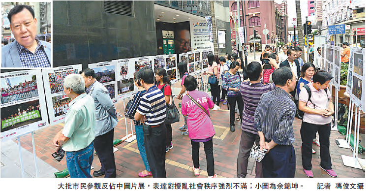 「保普選、反暴力大聯盟」昨日在港九新界19個地點舉辦「反佔中一周年圖片展」,主題為「毋忘佔中禍害、慎防動亂再來」。香港廣東社團總會一行10多人到位於上環摩利臣街的圖片展街站支持。總會副主席兼財務審批主任余錦坤表示,這個圖片展可以讓更多人知悉「佔中」對香港的禍害,反映這是一個極不受港人歡迎的行動。