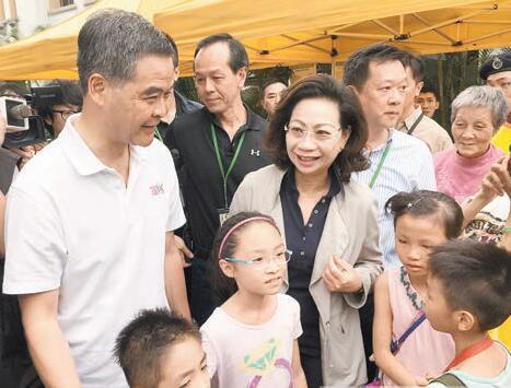 【香港商報訊】記者馮仁樂報道:禮賓府昨日開放,於早上已有近百人在門外等候。特首梁振英(CY)及太太梁唐青儀早上曾現身歡迎游客,與參觀市民親切交流,期間梁振英與數名小孩聊天,但他們均無回應記者提問。