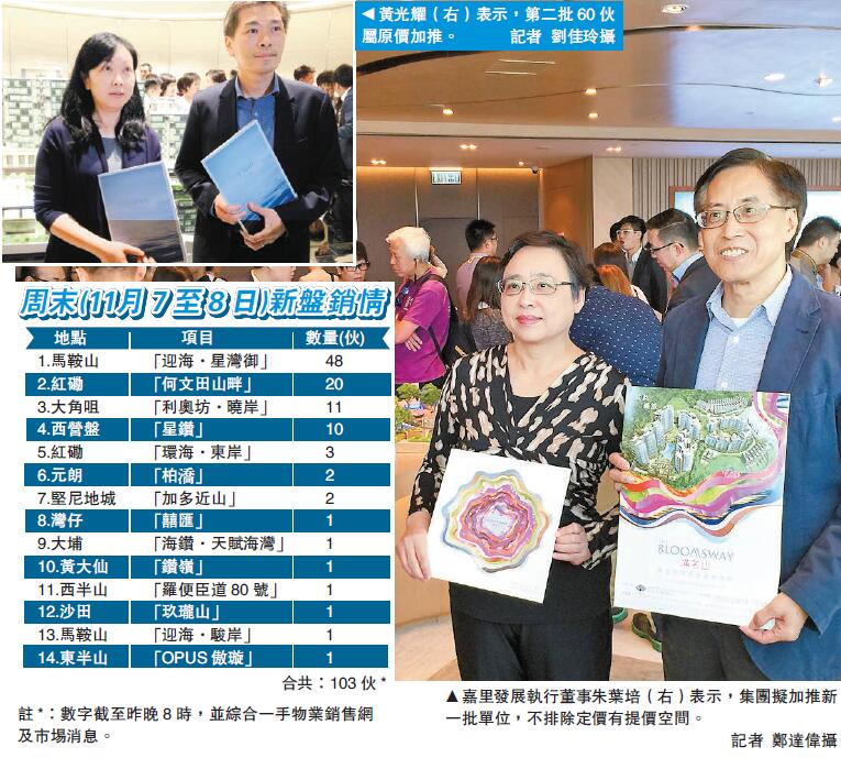 除了上述兩大焦點新盤,過去周末一手市場反應同樣熱鬧,綜合一手物業銷售網及市埸消息,過去兩日共錄得103宗一手成交,其中,永泰與南豐合作發展的紅磡「何文田山畔」上周六開售27伙,即日沽出19伙,平均成交尺價約2.12萬元,套現逾2億元。永泰地產執行董事兼營業及市務總監陳玉成表示,買家當中用家及投資者各占一半,亦有投資者因看好項目的升值潛力及租務需求,大手購入3伙作長線收租之用,估計涉資約2500萬元。