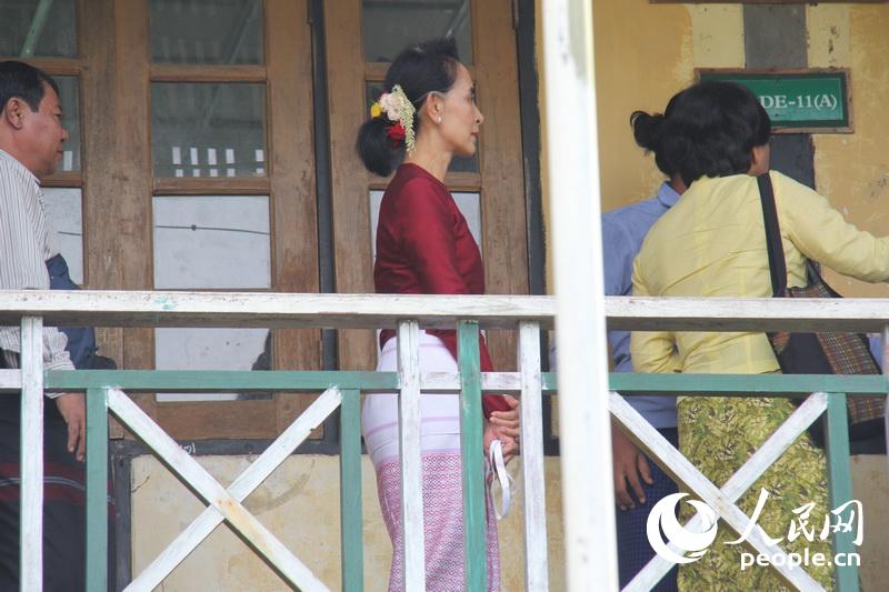昂山素季前往自己是候選人的投票點。人民網記者王天樂攝